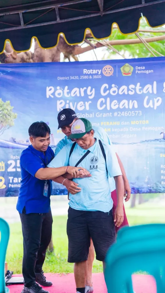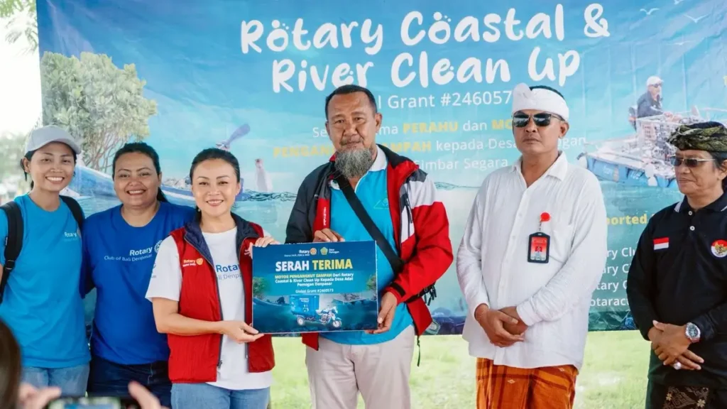 Sebagai bentuk kepedulian membantu membersihkan mangrove dan sungai, Rotary Bali Denpasar melalui program Rotary Coastal dan River Clean Up menyerahkan alat kebersihan sungai.